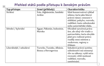 Cílem této práce je analyzovat a porovnat rozdíly v postavení žen v islámských zemích s přísným a liberálním přístupem k ženským právům. Práce se zaměří na geografické, historické a politické faktory ovlivňující postavení žen v islámských společnostech a identifikuje klíčové příčiny těchto rozdílů. Bude zkoumat vliv politických režimů, historických změn a mezinárodního tlaku na situaci žen, přičemž se zaměří na rozdíly mezi oficiálními zákony a jejich praktickou implementací. Důraz bude kladen na analýzu legislativy, vzdělání, pracovních práv, manželství a každodenní reality žen v různých islámských zemích. Cílem je poskytnout komplexní pohled na to, jak se přístupy k ženským právům liší v závislosti na politických a kulturních faktorech v islámském světě.