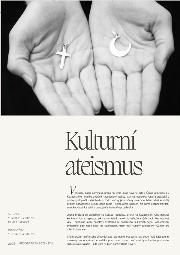 Tato práce se zaměřuje na fenomén kulturního ateismu – tedy situaci, kdy lidé, kteří se nehlásí k žádnému náboženství, nadále dodržují náboženské tradice, používají náboženské symboly nebo navštěvují sakrální místa. Tento jev je zkoumán na příkladu dvou kulturně i historicky odlišných zemí – České republiky a Kazachstánu. Obě země prošly obdobím intenzivní sekularizace, přesto v nich náboženské prvky přetrvávají i mezi nevěřícími.
