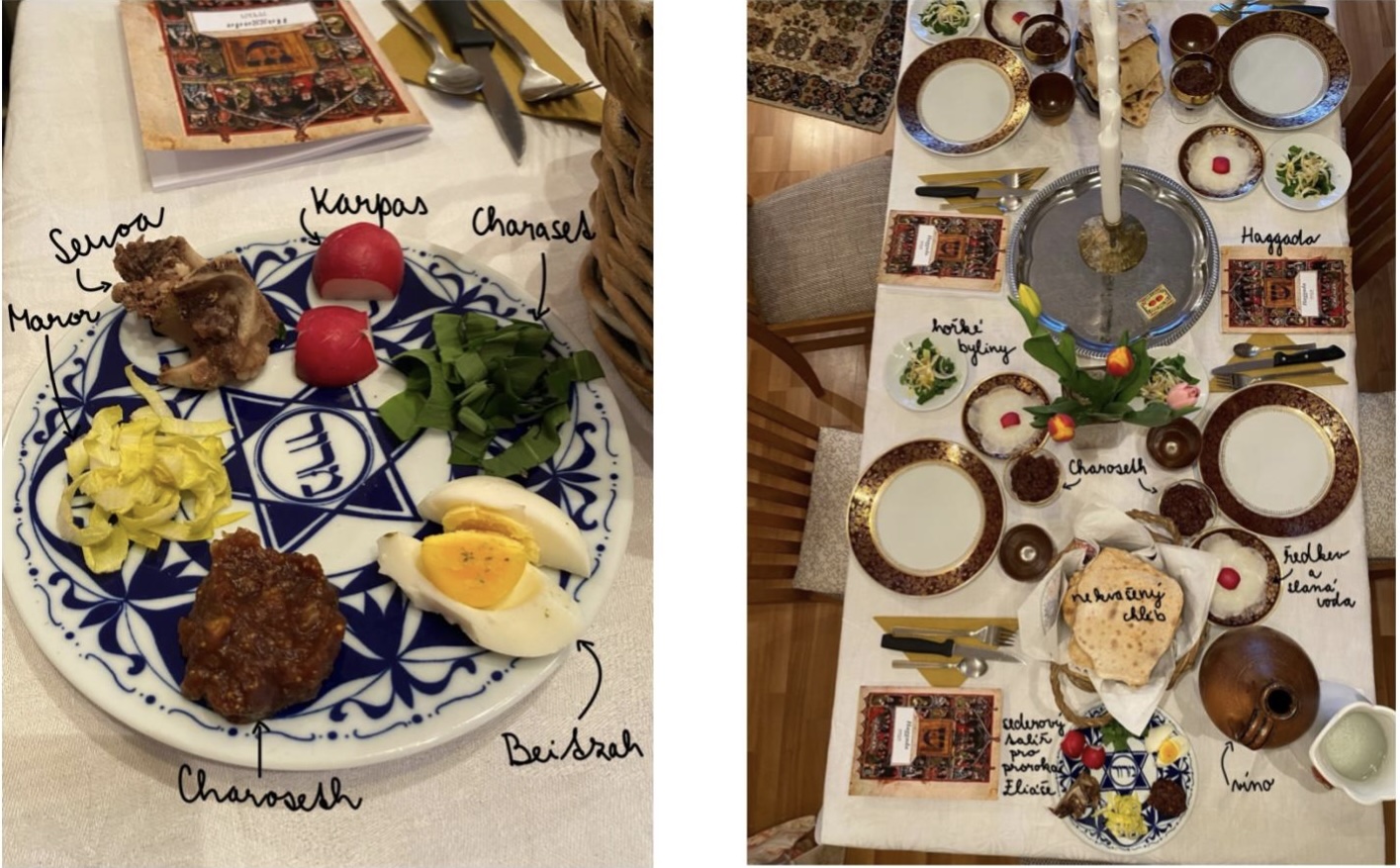 Pro začátek je důležité říct, že pocházím z multi-náboženské rodiny. Půlka mé rodiny je křesťanská a půlka židovská, proto jednotlivé tradice i pokrmy mohou být lehce ovlivněny i křesťanskými tradicemi. Sederová večeře probíhá tradičně u mé křesťanské tety a strýce, ačkoliv jsou křesťané snaží se v nás zanechat kus židovství. Naše prostředí, ve kterém se to koná tedy není košer na Pesach. Samozřejmě jsou ale všechny potraviny košer. Sederová večeře, které jsem se účastnila, se řídila podle zjednodušené verze Hagady, kterou vytvořil můj strýc. Tento rok se Seder konal 12. dubna, tedy první den Pesachu.